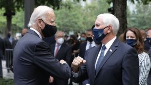 Mr Biden greeted Mr Pence at the World Trade Center site in New York earlier in the day, and the pair touched elbows in lieu of a handshake to observe protocols aimed at preventing the spread of coronavirus.