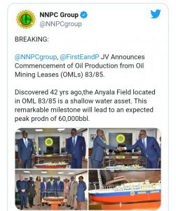 NNPC, First Exploration and Petroleum Development Company commenced oil production from Anyala Field.