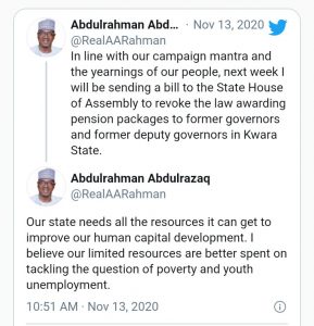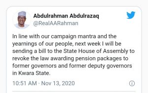 “In line with our campaign mantra and the yearnings of our people, next week I will be sending a bill to the State House of Assembly to revoke the law awarding pension packages to former governors and former deputy governors in Kwara State.