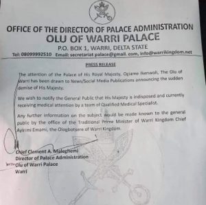 Maleghemi, explained that the clarifications became necessary following news and social media speculations on the sudden demise of The Olu of Warri, Ogiame Ikenwoli.