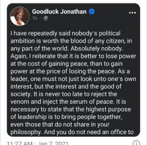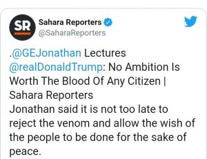 But former Nigerian President Goodluck Jonathan, who famously made a phone call to concede his defeat and congratulate his successor, Muhammadu Buhari, in what was an unprecedented move for the country, gave Trump a stern reprimand.