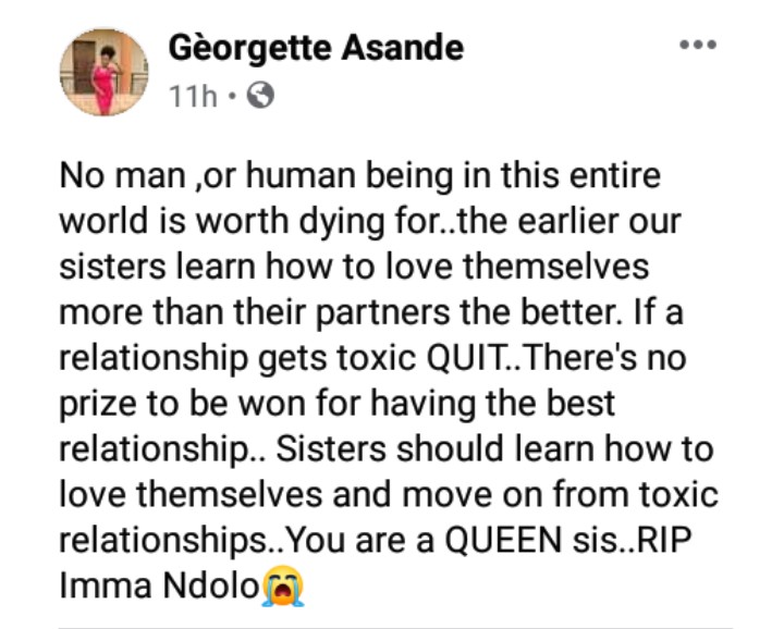 Geogette Asande: “No man ,or human being in this entire world is worth dying for..the earlier our sisters learn how to love themselves more than their partners the better. If a relationship gets toxic QUIT..There’s no prize to be won for having the best relationship.. Sisters should learn how to love themselves and move on from toxic relationships..You are a QUEEN sis..RIP Imma Ndolo”