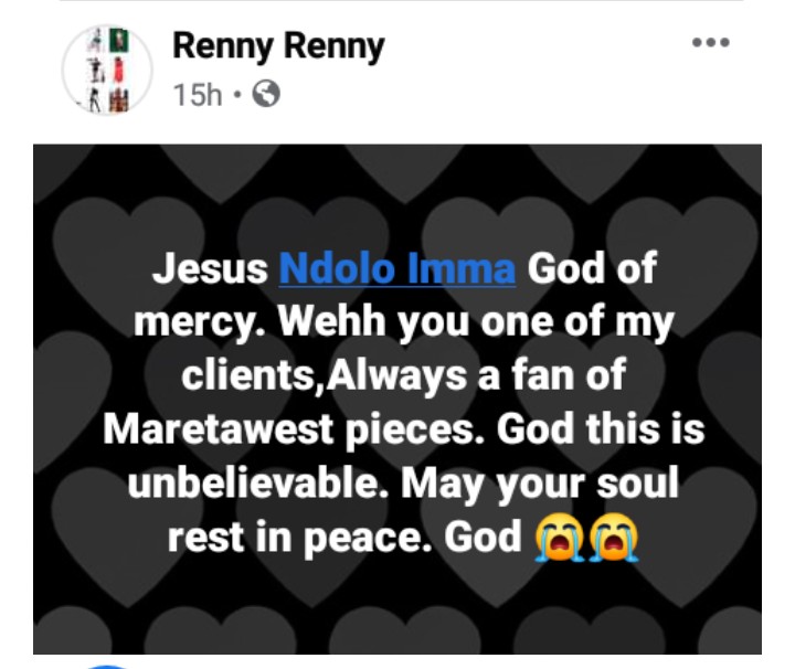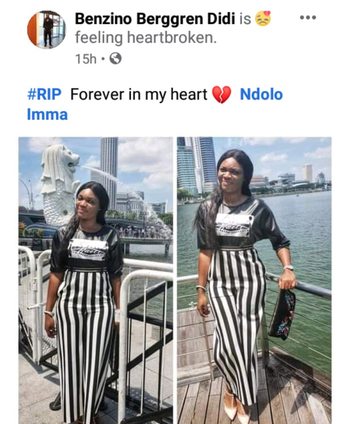 An Nche wrote: “Ndolo Imma, you didn’t deserve to die for that which itself is the source of happiness to many ! A counterfeit man wasn’t worth your tears, talk lest of your soul. A tall, intelligent, beautiful, electric, fashionable and genuine person ! Our paths crossed on facebook sometime ago. You were so true and total ! What will make a man do this to you? What will bring you to give up on life? So young ? May your gentle soul rest in peace!”