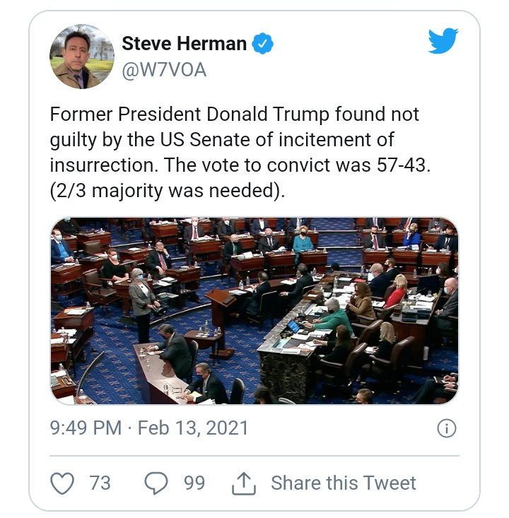 Democrats managed to win two more Republican votes, compare to when the Senate voted in late January to go forward with the trial. Still, only seven Republican Senators broke ranks with their party to find Trump guilty.