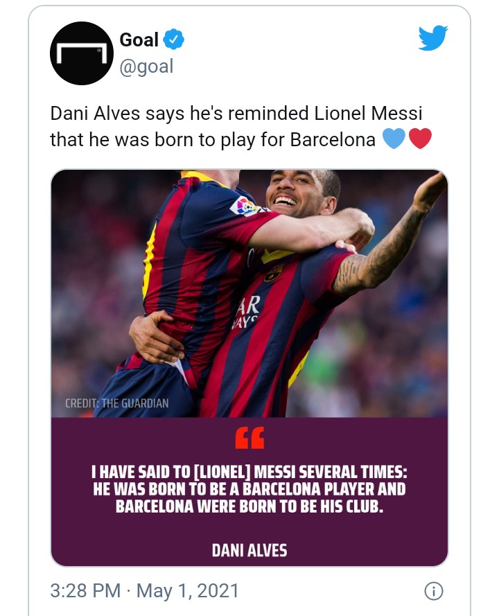 “I have said to Messi several times: he was born to be a Barcelona player and Barcelona were born to be his club,” Alves explained in an interview with the Guardian.