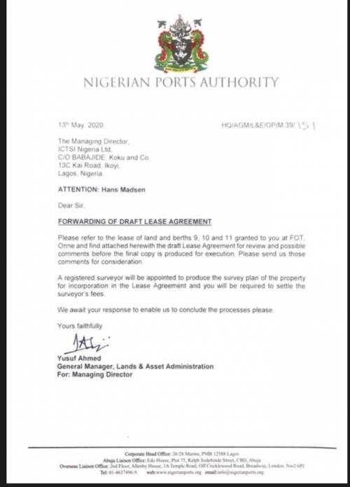 “Please refer to the lease of land and berths 9, 10 and 11 granted to you at FOT Onne and find attached herewith the draft Lease Agreement for a review of its possible contents before the final copy is produced for execution,” the letter addressed to the managing director of ICTSI read.