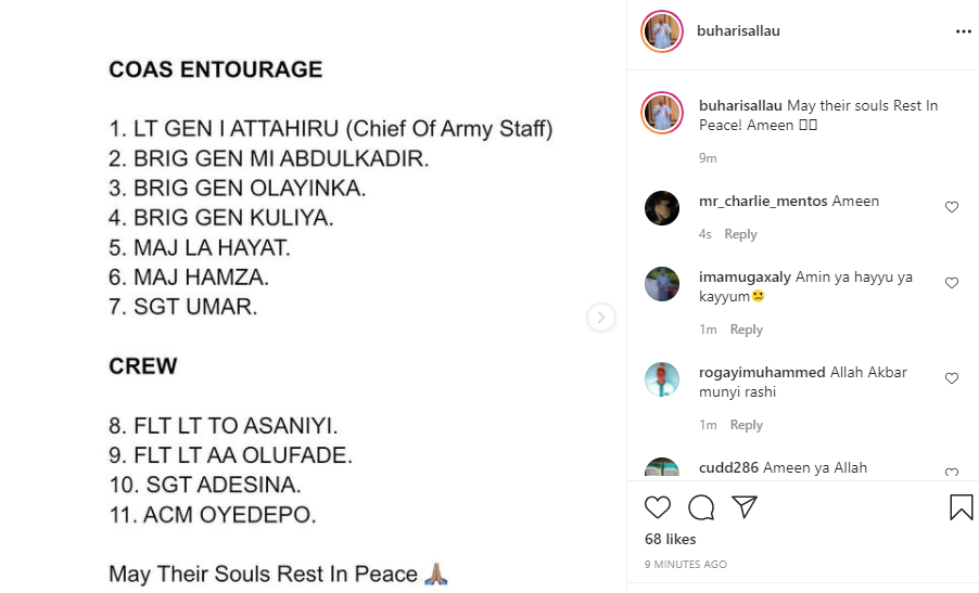 Buhari Sallau, Personal Assistant to President Muhammadu Buhari on Broadcast Media who published the list, disclosed that 11 people died in the plane crash.