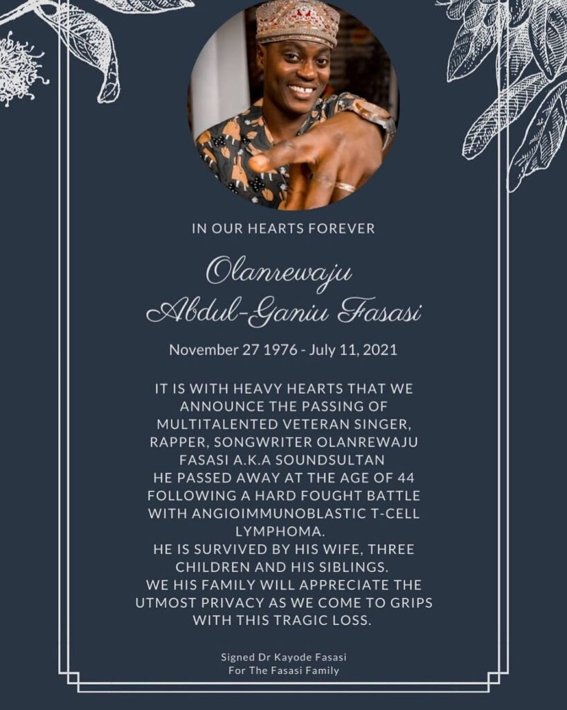 Singer, Olanrewaju Fasasi also known as Sound Sultan, is dead. A statement released by his family says he died on July 11 after a long battle with throat cancer. The singer is survived by his wife and three children.
