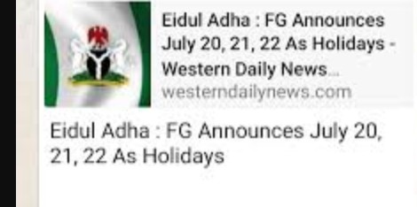 There are viral reports on news blogs and broadcast on social media platforms especially Whatsapp; stating that the Federal Government on Tuesday announced three-day Eid-ul-Adha holidays from July 20 to 22.