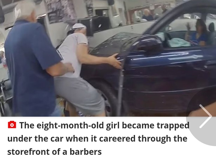 An eight-month-old girl became stuck under the vehicle after the driver struck a curb, a parked vehicle and two pedestrians before careering through the storefront of a barbers shop