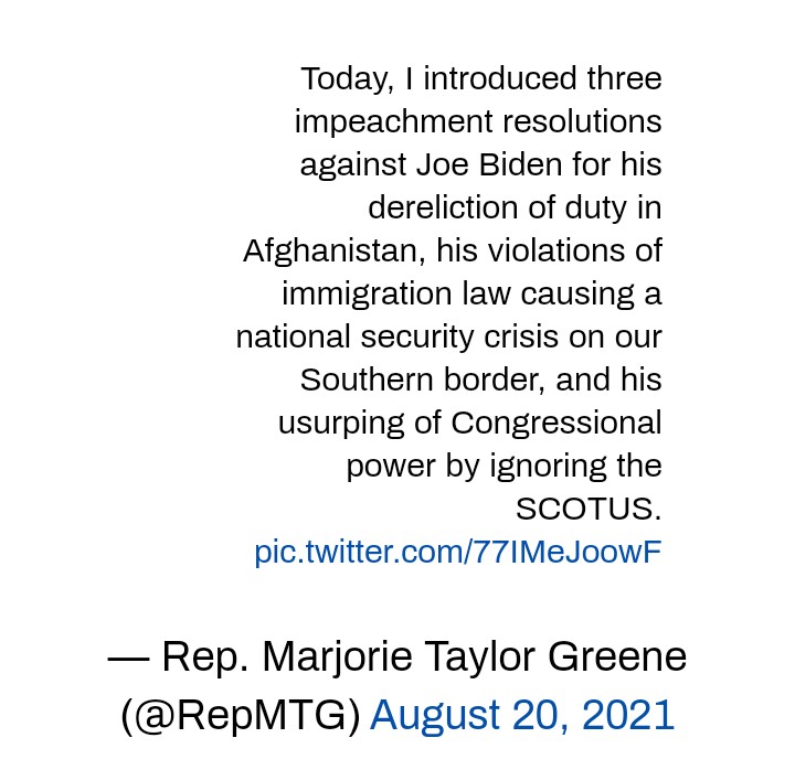 Nonetheless, in addition to alleged “dereliction of duty” in Afghanistan and failing to act on the “border crisis,” Taylor Greene also argued that Biden acted as a “pseudo-dictator” by “[ignoring] the Supreme Court” and issuing “his own eviction moratorium.”