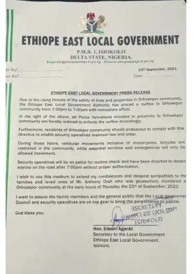 “Due to the rising threats to the safety of lives and properties in Orhoakpor Community, the Ethiope East Local Government Authority has placed a curfew in Orhoakpor Community from 7 p.m to 7 a.m with effect immediately,”
