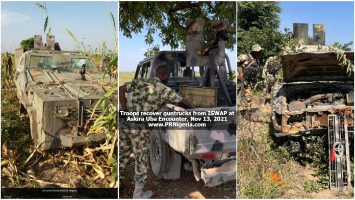 The source told PRNigeria that about nine gun trucks, an armoured personnel carrier and one Mine-Resistant Ambush Protected, MRAP, were destroyed or recovered by the Nigerian troops.