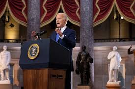 Biden never uttered Trump’s name in his speech, but he referred repeatedly to the former president with forceful, and at times personal, denunciations of his actions. Trump, Biden said, “values power over principle.” His “bruised ego matters more to him than our democracy,” the president continued, adding, “He can’t accept that he lost.”