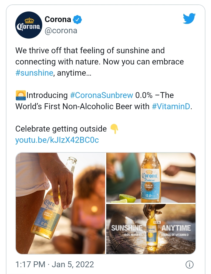 Corona has rolled out a new non-alcoholic beer, named ‘Sunbrew’ because it is replete with Vitamin D.
