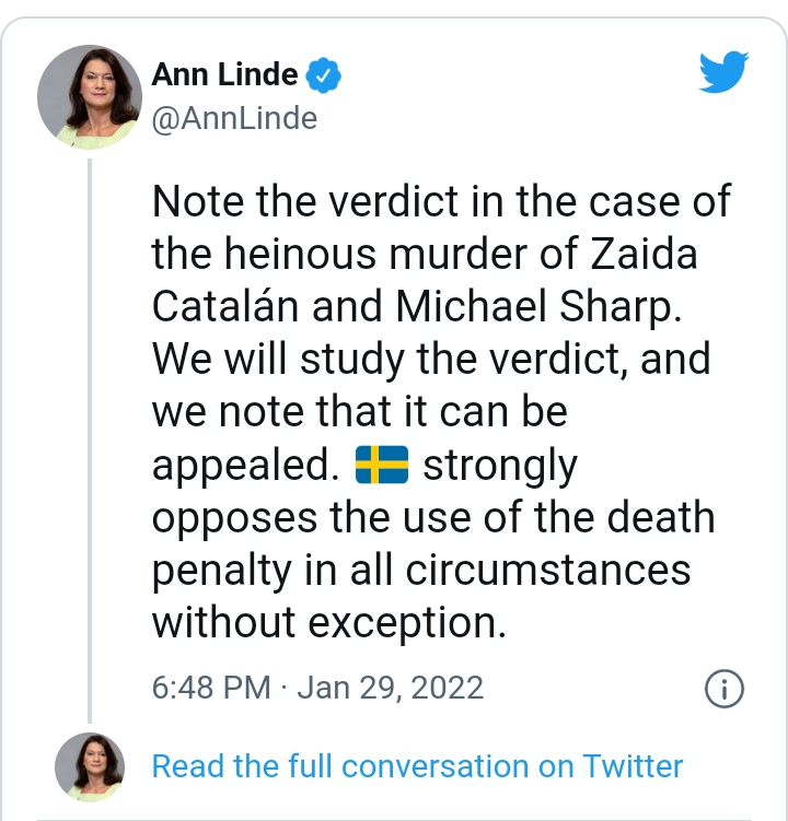 Swedish Minister of Foreign Affairs Ann Linde said on Twitter that investigations must continue.