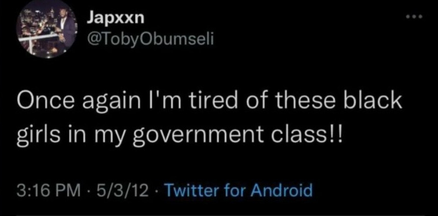In tweets shared between 2012 to 2018, he slut-shamed black women and said he doesn’t talk to them.