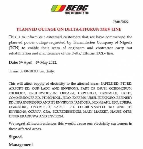 It reads in part: “This is to inform our esteemed customers that we have commenced the planned power outage requested by Transmission Company of Nigeria (ICN) to enable their team of engineers and contractor to carry out rehabilitation and maintenance of the Delta/ Effurun 132kv line.