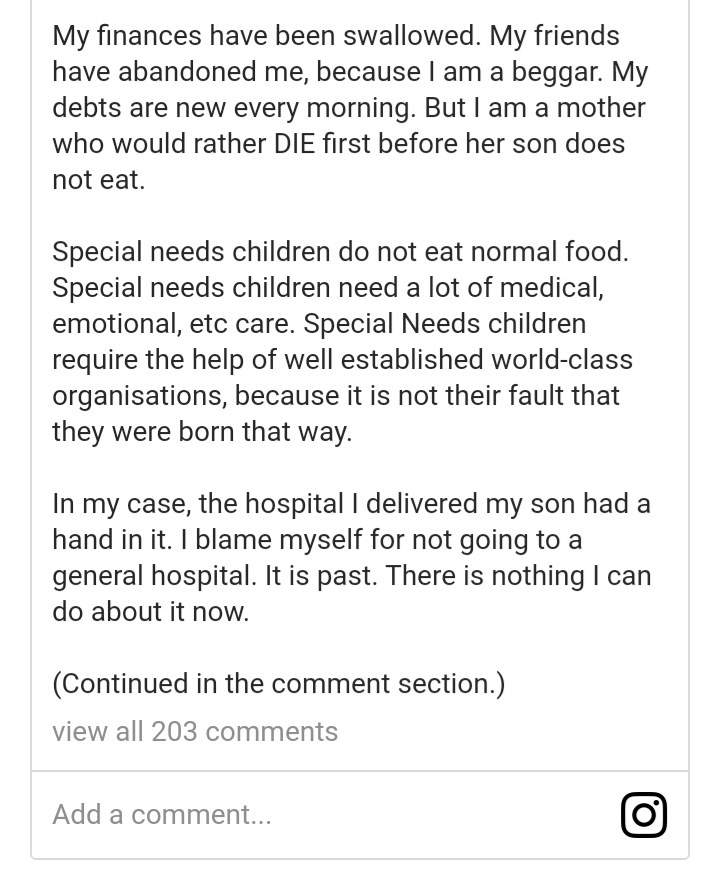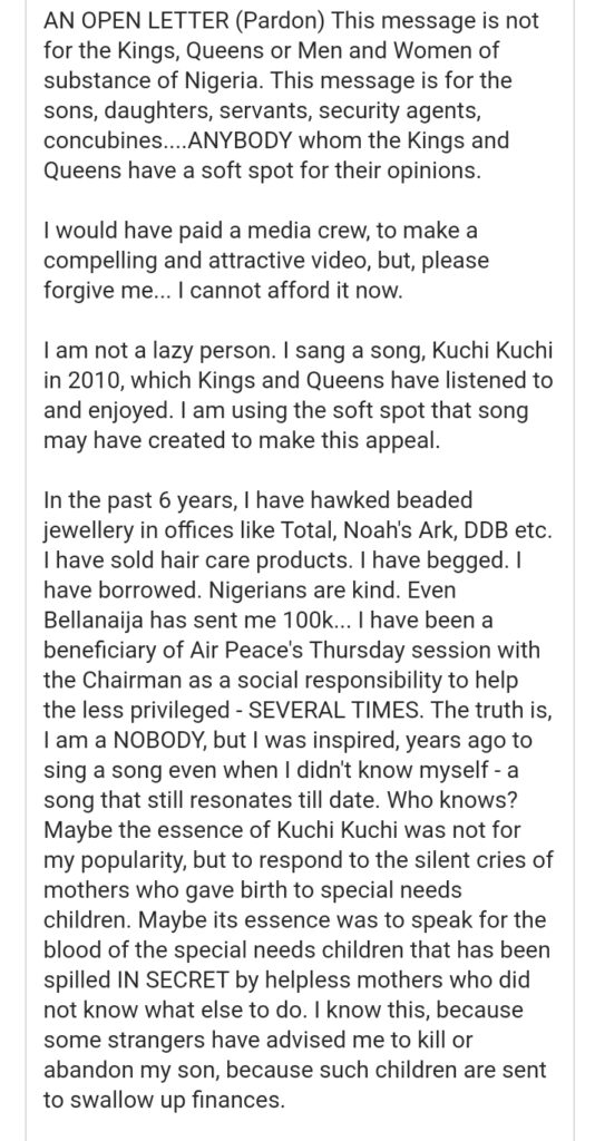 According to the singer, her 6-year-old son, Chinua is suffering from a medical condition known as cerebral palsy and she is seeking the aid of Nigerians, albeit, she has been mocked and ridiculed due to the ailment of her son.