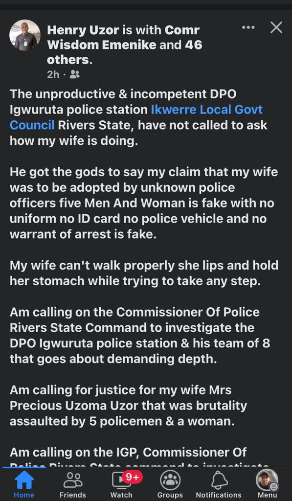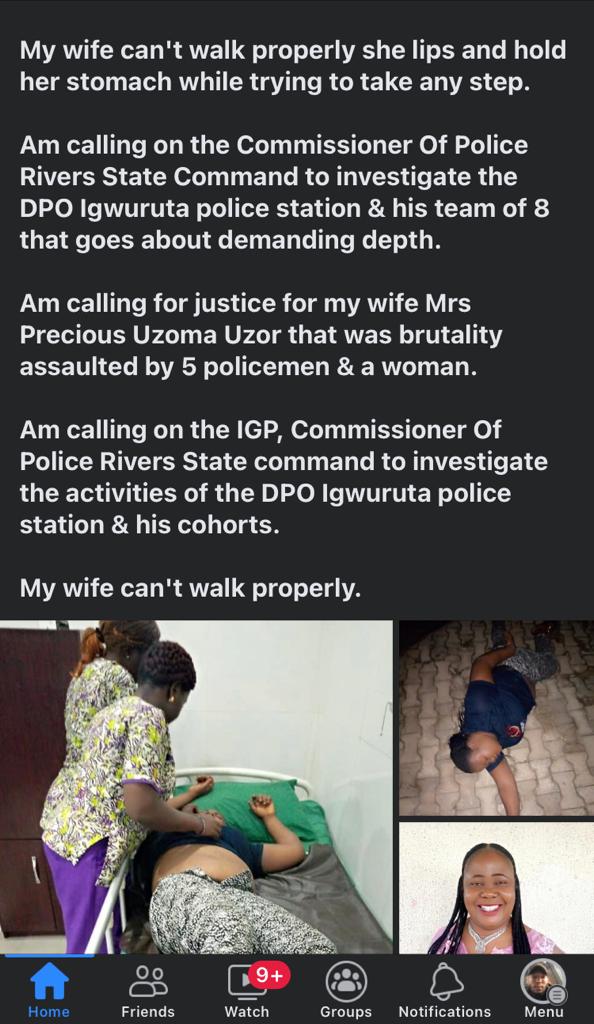 A resident of Igwuruta community in Ikwerre Local Government Area of Rivers State, Henry Uzor has call out the DPO of Igwuruta Police Station over unlawful arrest and manhandling of his wife by the police which has landed her in hospital.