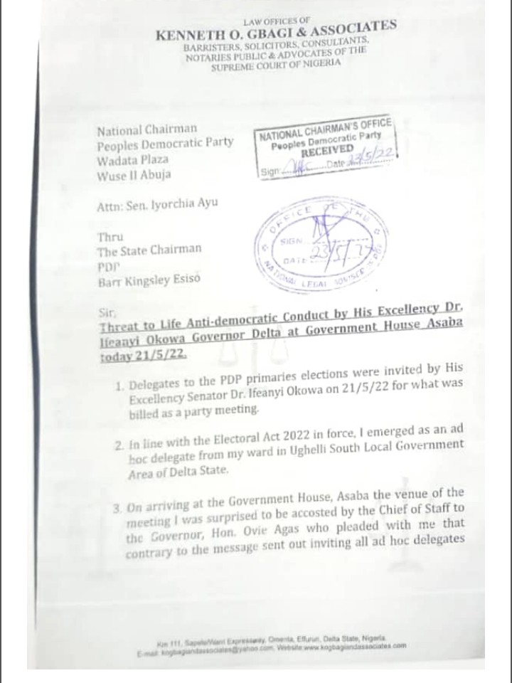 The protest letter signed by Gbagi, titled: “Threat to Life Anti-democratic Conduct by His Excellency Ifeanyi Okowa Governor Delta at Government House Asaba”, and addressed to the PDP National Chairman, State Chairman, with critical stakeholders copied, reads: