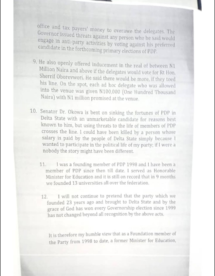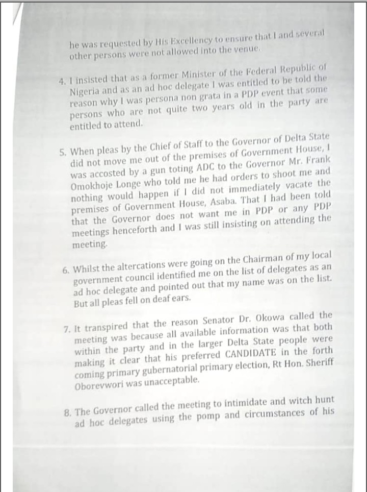 “When pleas by the Chief of Staff to the Governor of Delta State did not move me out of the premises of Government House, I was accosted by a gun totting ADC to the Governor Mr. Frank Omokhoje Longe who told me he had orders to shoot me and nothing would happen if I did not immediately vacate the premises of Government House, Asaba. That I had been told that the Governor does not want me in PDP or any PDP meetings henceforth and I was still insisting on attending the meeting.