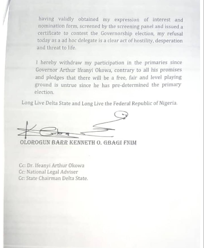 “I hereby withdraw my participation in the primaries since Governor Arthur Ifeanyi Okowa, contrary to all his promises and pledges that there will be a free, fair and level playing ground is untrue since he has pre-determined the primary election”.
