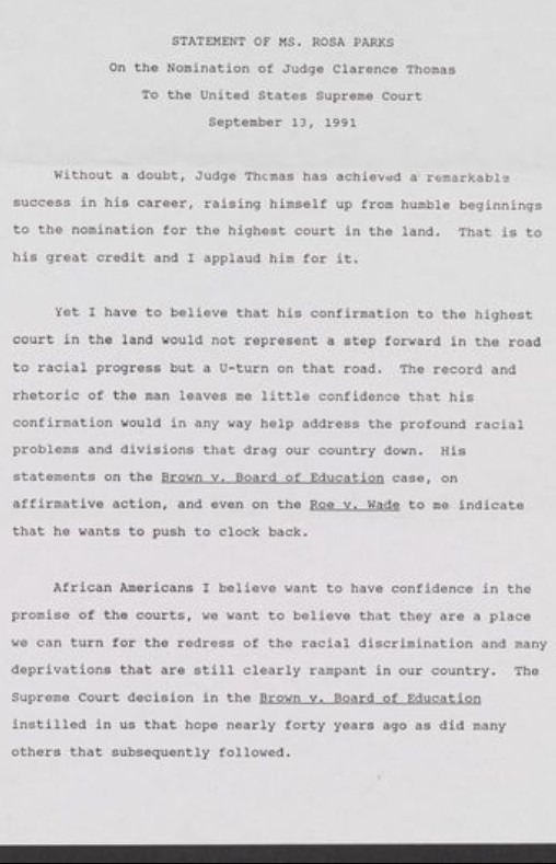 A Twitter post is going viral after it resurfaced civil rights icon Rosa Parks’ thoughts on Supreme Court Justice Clarence Thomas’ confirmation in 1991.