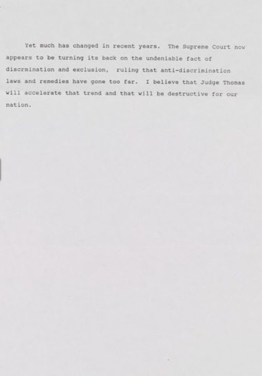 “His confirmation to the highest court in the land would not represent a step forward in the road to racial progress but a u-turn on that road,” she wrote. “His statements on Brown v. Board of Education case… and even on the Roe v. Wade to me indicate that he wants to push the clock back… The Supreme Court now appears to be turning its back on the undeniable fact of discrimination and exclusion …I believe that Judge Thomas will accelerate that trend and that will be destructive for our nation.”