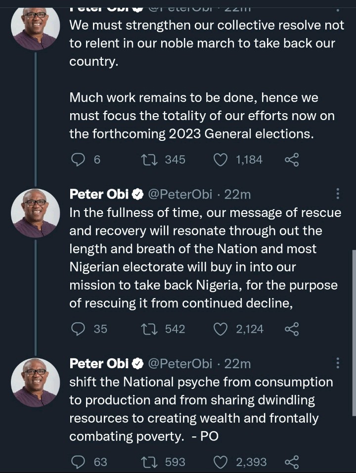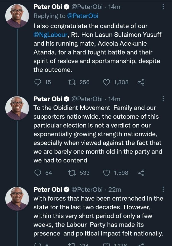 The Presidential Candidate of the Labour Party, Mr. Peter Obi has taken to his official Twitter handle to reply to those shading the Labour Party for having just 2,000+ votes in the just concluded gubernatorial election in Osun State. In his bid to congratulate the Governor-elect of Osun State, Senator Ademola Adeleke, Peter Obi noted that it is important for those lambasting the Labour Party for scoring a poor number of votes to know that the Labour Party movement is just a one-month-old movement in the country.