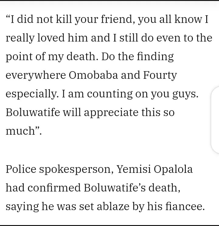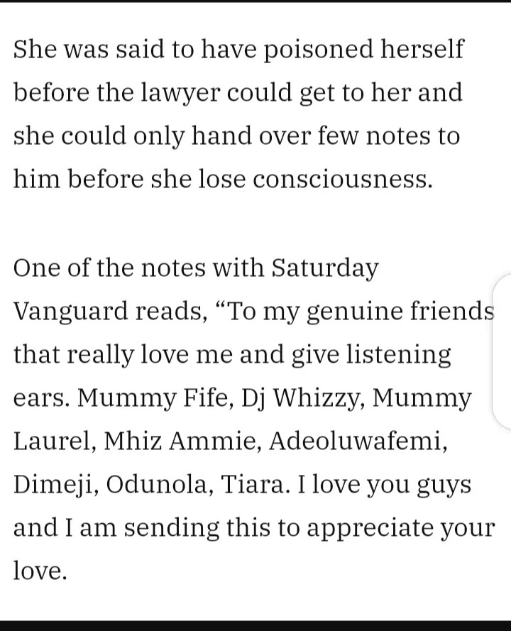 Ifeoluwa ran away after the incident and when she got to Ilesha, she contacted her lawyer. Before her lawyer could get to her, Ifeoluwa had already poisoned herself. In the suicide note, she said she really loved her fiancé even to the point of her death.