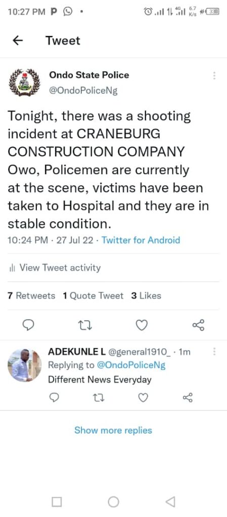 As at 10:24Pm of Thursday night, Ondo State Police Command released a Tweet on its official handle Stating that there was a reported shooting at a Construction Company by the name CRAMEBURG.in Owo .