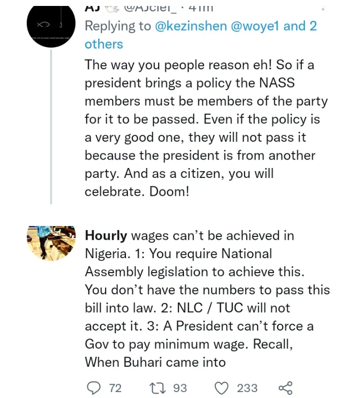Some of those who had reacted to this proposed payment had praised such a move, while some others are of the view that such moves cannot be achieved in Nigeria because the president cannot enforce payment of minimum wages. Such a move would also require National Assembly legislation and the Trade Union Congress and Nigeria Labour Congress would not accept it.