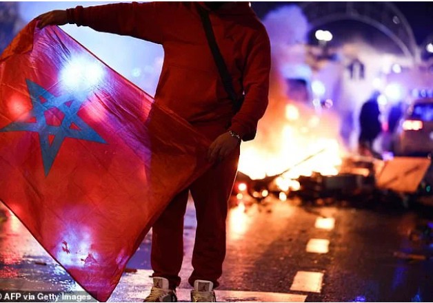 The Netherlands’ large Moroccan community burst into celebrations, lighting torches and fireworks and driving around hooting car horns and waving Moroccan flags shortly after the match ended.