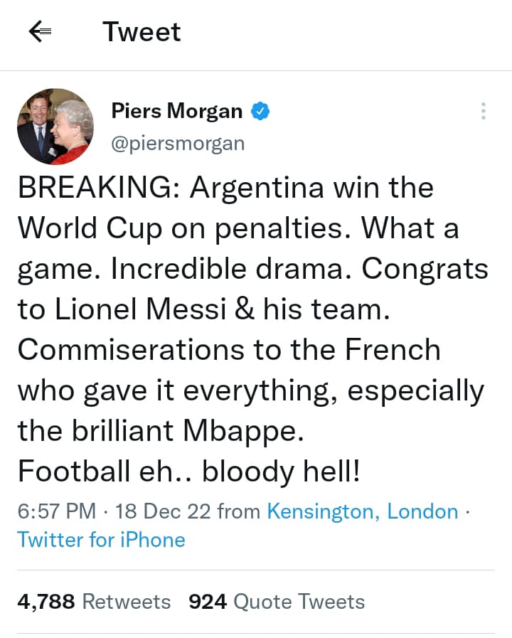 Piers Morgan tweeted after the match; “BREAKING: Argentina win the World Cup on penalties. What a game. Incredible drama. Congrats to Lionel Messi and his team. Commiserations to the French who gave it everything, especially the brilliant Mbappe.
