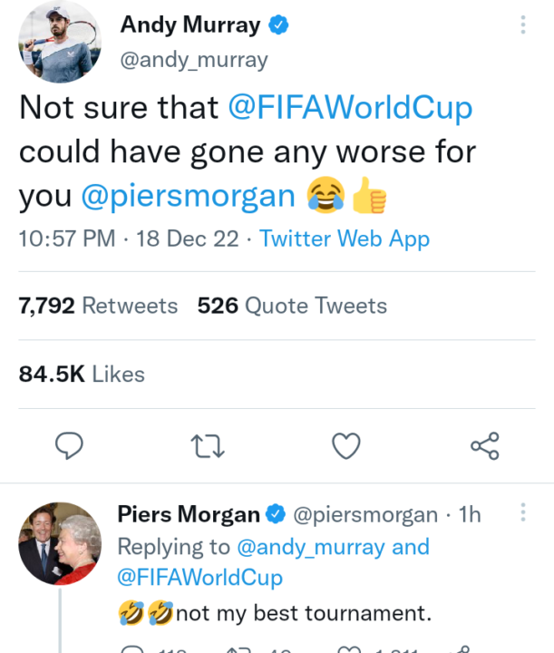 Tennis icon, Andy Murray has taken a swipe on British journalist and television personality; Piers Morgan after he congratulated Messi and Argentina for lifting the 22nd edition of FIFA World Cup which he predicted that Argentina will lose and “Messi will cry”.