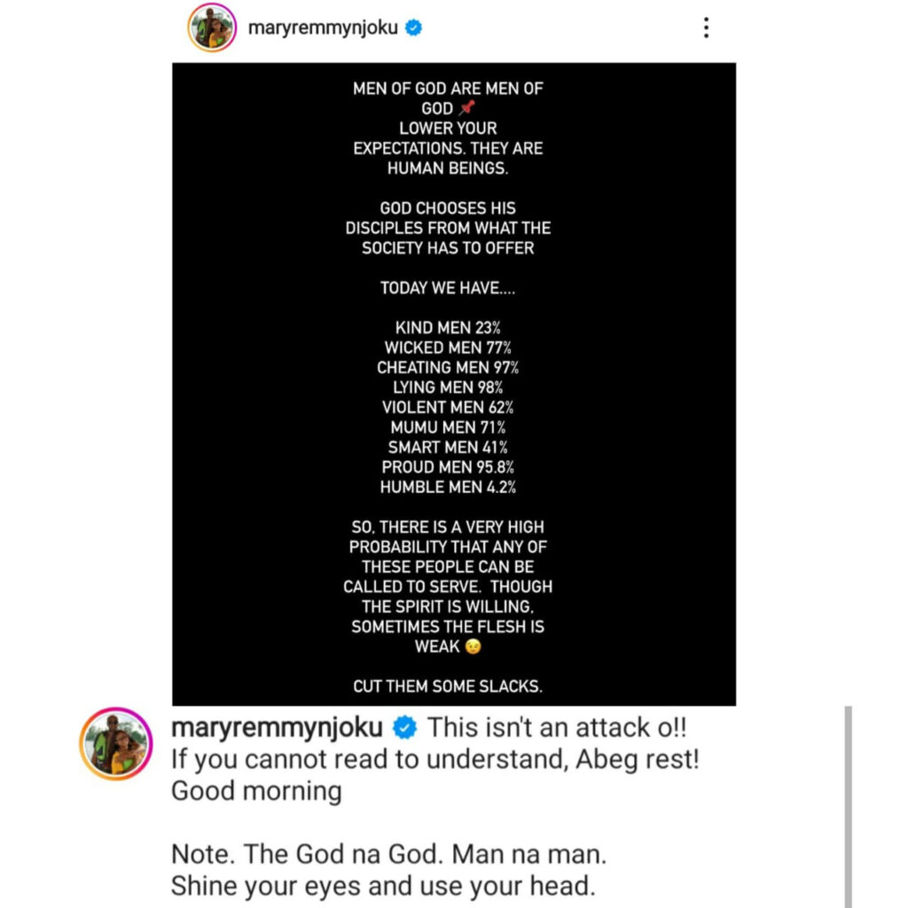 Actress Mary Njoku has advised people to lower their expectations from Men of God (clerics) as they are human beings just like everyone.