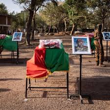 All the coffins were draped in Burkina Faso flags with a photo beside them.