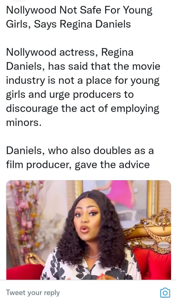 Nollywood actress, Regina Daniels, has warmed young girls to steer off the movie industry as it is not a place for minors and urge producers to discourage the act of employing minors.