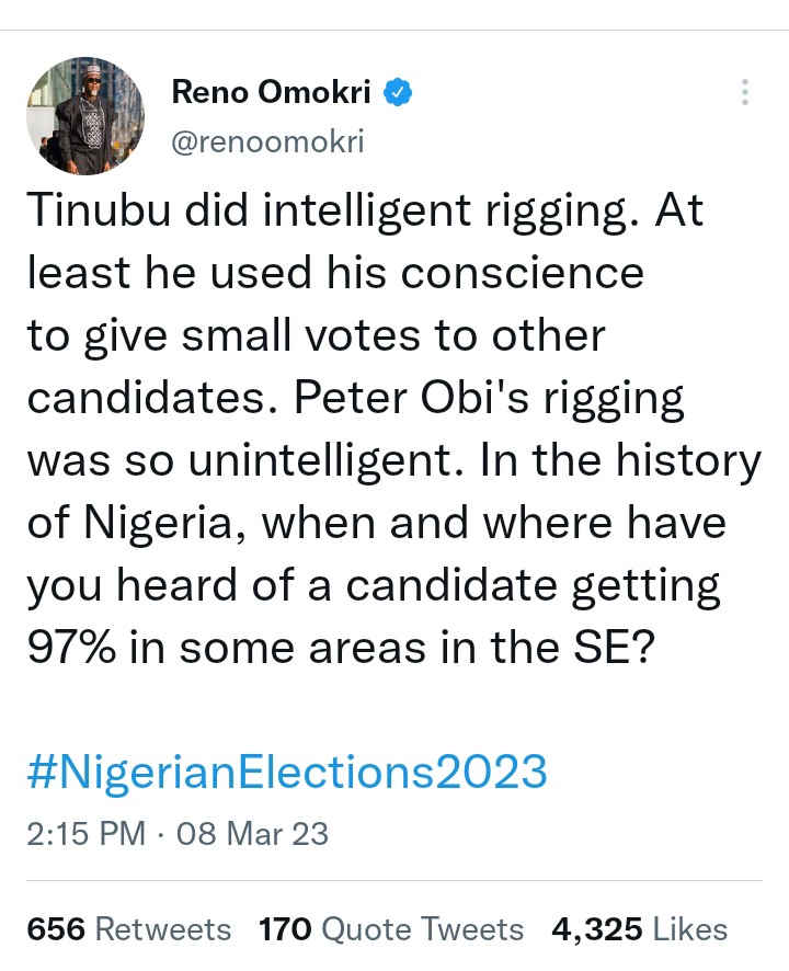 Tinubu did intelligent rigging. At least he used his conscience to give small votes to other candidates. Peter Obi’s rigging was so unintelligent. In the history of Nigeria, when and where have you heard of a candidate getting 97% in some areas in the SE?