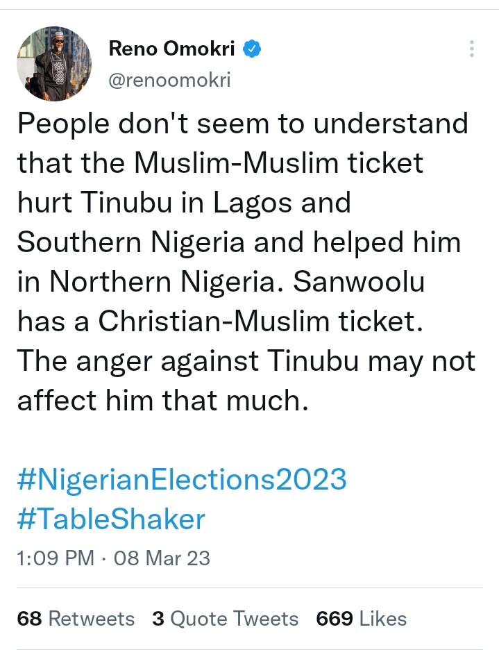 People don’t seem to understand that the Muslim-Muslim ticket hurt Tinubu in Lagos and Southern Nigeria and helped him in Northern Nigeria. Sanwoolu has a Christian-Muslim ticket. The anger against Tinubu may not affect him that much.