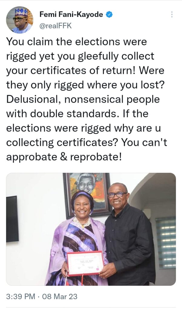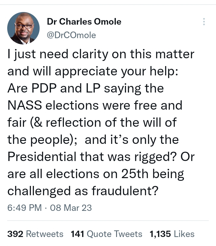 Are PDP and LP saying the NASS elections were free and fair (& reflection of the will of the people); and it’s only the Presidential that was rigged? Or are all elections on 25th being challenged as fraudulent?