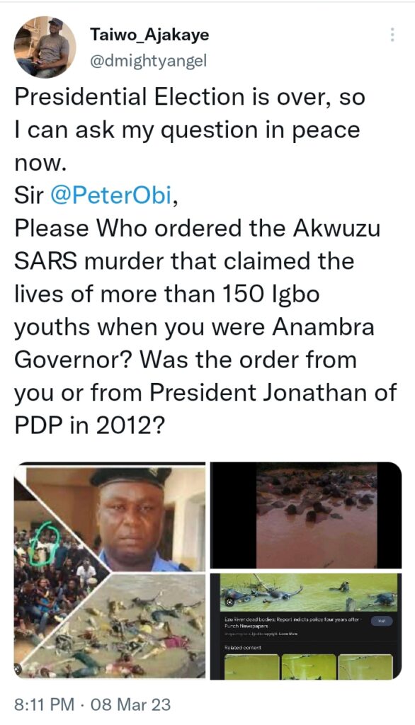 Please Who ordered the Akwuzu SARS murder that claimed the lives of more than 150 Igbo youths when you were Anambra Governor? Was the order from you or from President Jonathan of PDP in 2012?