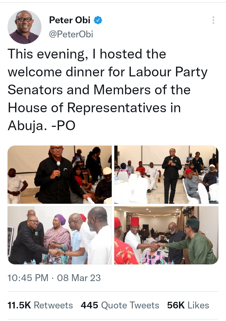 This evening, I hosted the welcome dinner for Labour Party Senators and Members of the House of Representatives in Abuja. -PO