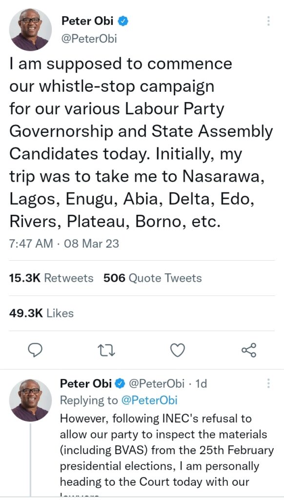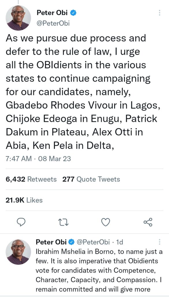 As we pursue due process and defer to the rule of law, I urge all the OBIdients in the various states to continue campaigning for our candidates, namely, Gbadebo Rhodes Vivour in Lagos, Chijoke Edeoga in Enugu, Patrick Dakum in Plateau, Alex Otti in Abia, Ken Pela in Delta,