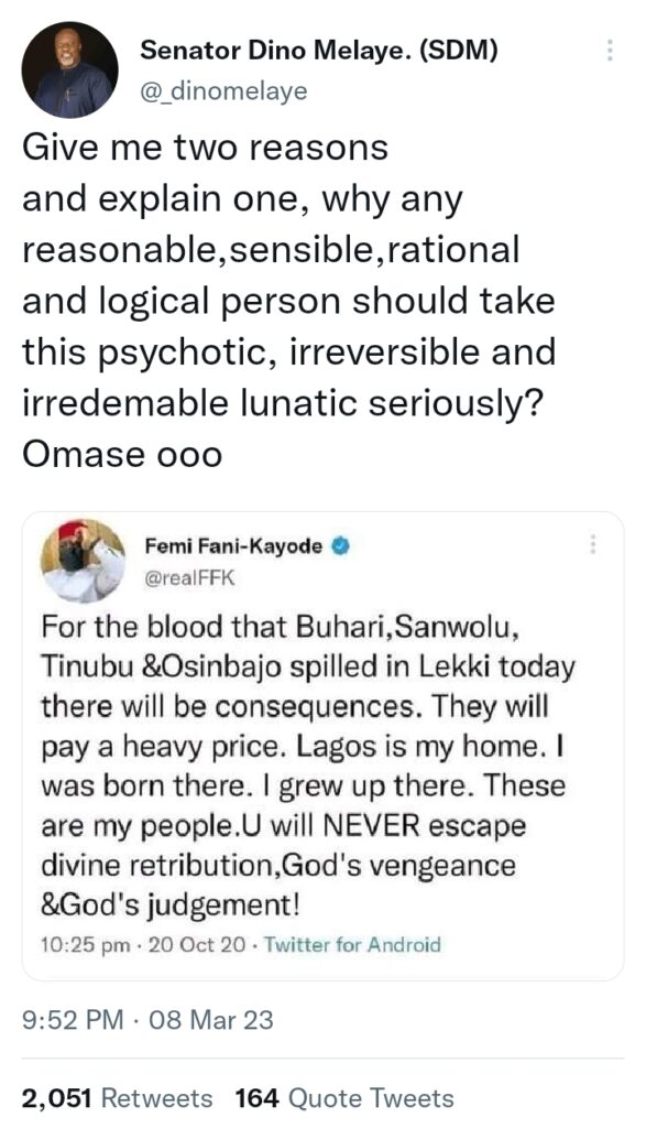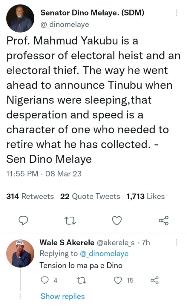 Prof. Mahmud Yakubu is a professor of electoral heist and an electoral thief. The way he went ahead to announce Tinubu when Nigerians were sleeping,that desperation and speed is a character of one who needed to retire what he has collected. – Sen Dino Melaye