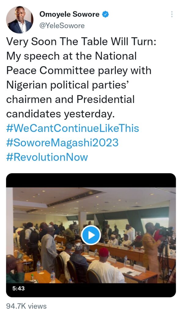 Very Soon The Table Will Turn: My speech at the National Peace Committee parley with Nigerian political parties’ chairmen and Presidential candidates yesterday.