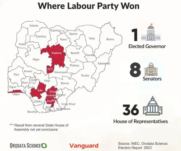 The party has one governor, Alex Otti of Abia State. But the numbers are in the legislative arm.