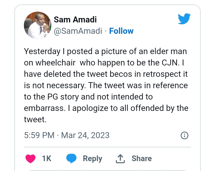 “Yesterday I posted a picture of an elder man on wheelchair who happens to be the CJN. I have deleted the tweet because in retrospect it is not necessary. The tweet was in reference to the PG story and not intended to embarrass. I apologise to all offended by the tweet,” the lawyer tweeted.