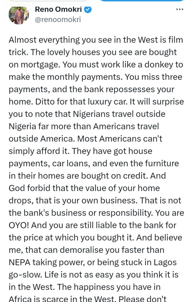 “The lovely houses you see are bought on mortgage. You must work like a donkey to make the monthly payments. You miss three payments, and the bank repossesses your home. Ditto for that luxury car. It will surprise you to note that Nigerians travel outside Nigeria far more than Americans travel outside America.
